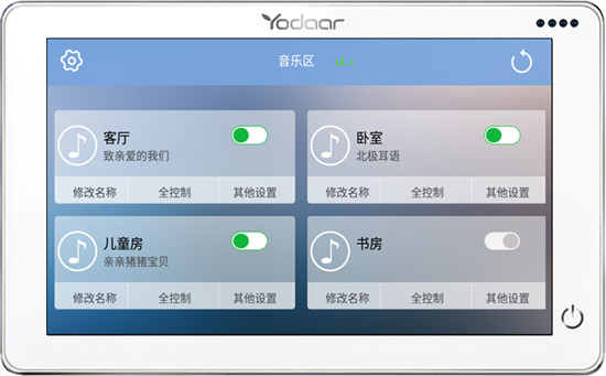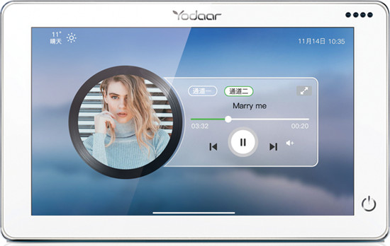 在保證出色的音質之外,悠達還從用戶操作角度出發,對中央機控制面板進行了全新升級,推出背景音樂中控屏。其最大的特色在于,一塊面板可以控制所有房間的音樂,免去所有繁瑣操作。同時,它還可控制智能家居、聯動云門鈴、實現安防監控,一屏四用,真正做到了行業獨家。