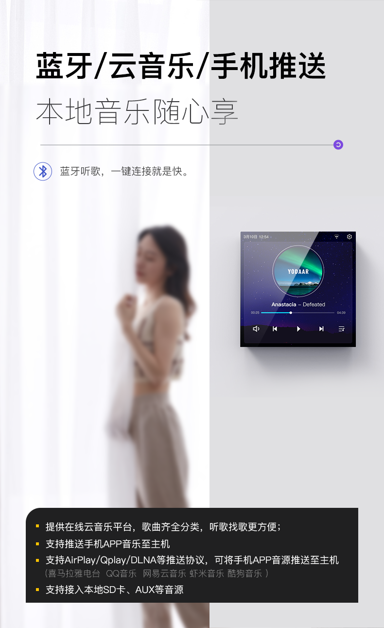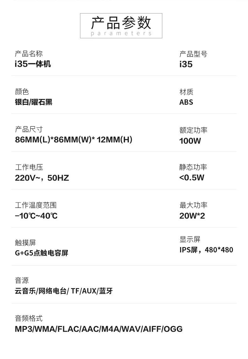 全新i35一體機(jī),采用全面屏設(shè)計(jì),4吋機(jī)身,更加精致小巧,可以搭配各種家裝風(fēng)格。除了外觀上的改變,各項(xiàng)功能也是十分優(yōu)異。音源上,提供藍(lán)牙、云音樂(lè)、手機(jī)推送、本地音樂(lè)等各種選擇,讓你在家想聽就聽。操作上,提供面板、AI語(yǔ)音、手機(jī)APP、手機(jī)遠(yuǎn)程等各種智控方式,讓操作更加簡(jiǎn)單、便捷。