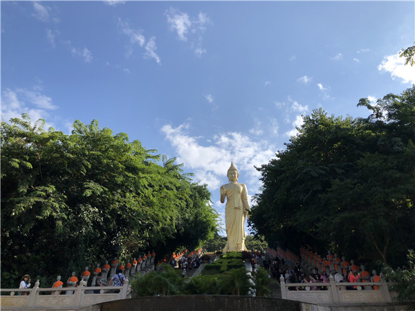 版納之行的最后一站,我們來到世界南傳佛教的文化中心——勐泐大佛寺。49米高的釋迦摩尼佛像巋然聳立,俯視蕓蕓眾生,八十羅漢托缽守護兩旁,莊嚴(yán)肅穆,此番神圣之景,讓人駐足仰望,敬畏之心便油然而生。